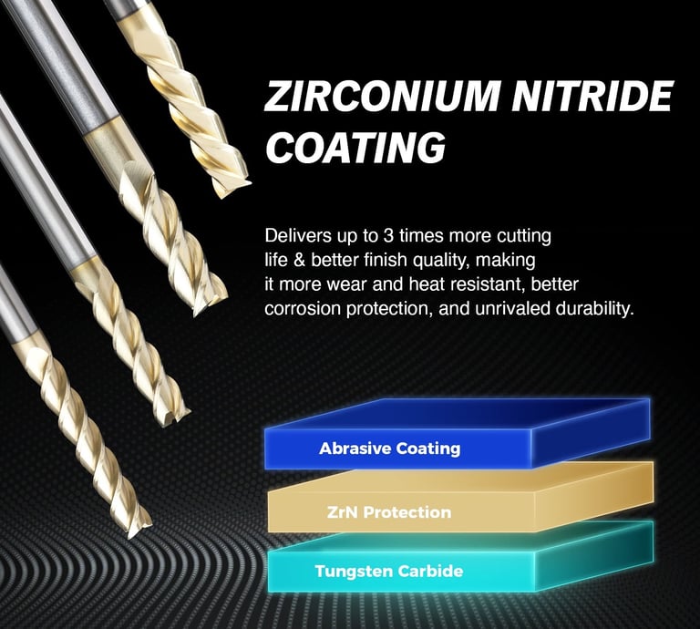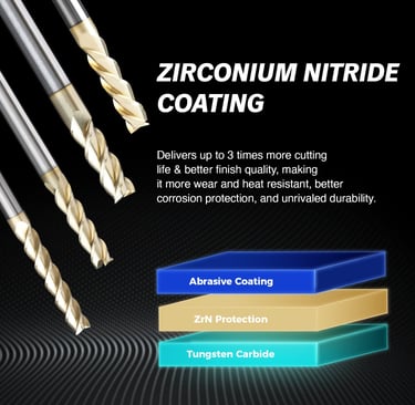 Zirconium nitride (ZrN) lubricates the end mill for stability at high temperature and superior wear resistance at high cutting speeds, offering better surface.